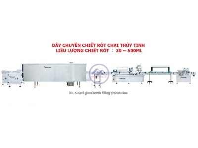 Dây chuyền sản xuất đóng chai này bao gồm bàn xoay,  máy rửa chai, đường hầm khử trùng và sấy khô , máy chiết rót và đóng nắp,...